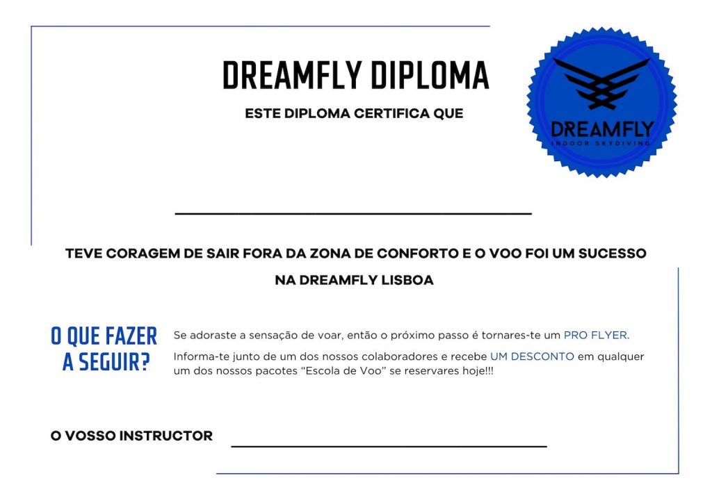 Quieres recordar este fantástico día? Tenemos un diploma y un registro fotográfico del salto para regalarte. Y no lo olvides: comparte con tus amigos todas las emociones que has vivido en nuestro túnel usando el hashtag #DreamFly.